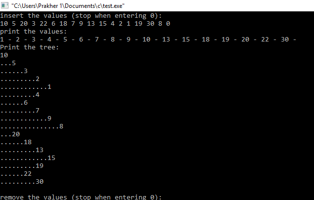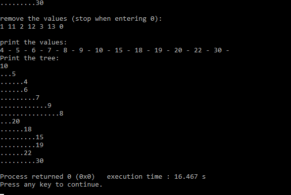 insert the values (stop when entering 0): 10 5 20 3 22 6 18 7 9 13 15 4 2 1 19 30 8 0 print the values: 1 - 2 - 3 - 4 - 5 - 6 - 7 - 8 - 9 - 10 - 13 - 15 - 18 - 19 - 20 - 22 - 30 - Print the tree: 10 ...5 ......3 .........2 ............1 .........4 ......6 .........7 ............9 ...............8 ...20 ......18 .........13 ............15 .........19 ......22 .........30 remove the values (stop when entering 0): 1 11 2 12 3 13 0 print the values: 4 - 5 - 6 - 7 - 8 - 9 - 10 - 15 - 18 - 19 - 20 - 22 - 30 - Print the tree: 10 ...5 ......4 ......6 .........7 ............9 ...............8 ...20 ......18 .........15 .........19 ......22 .........30