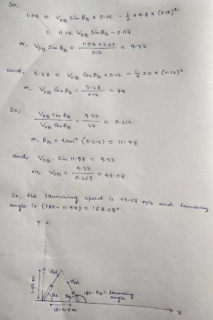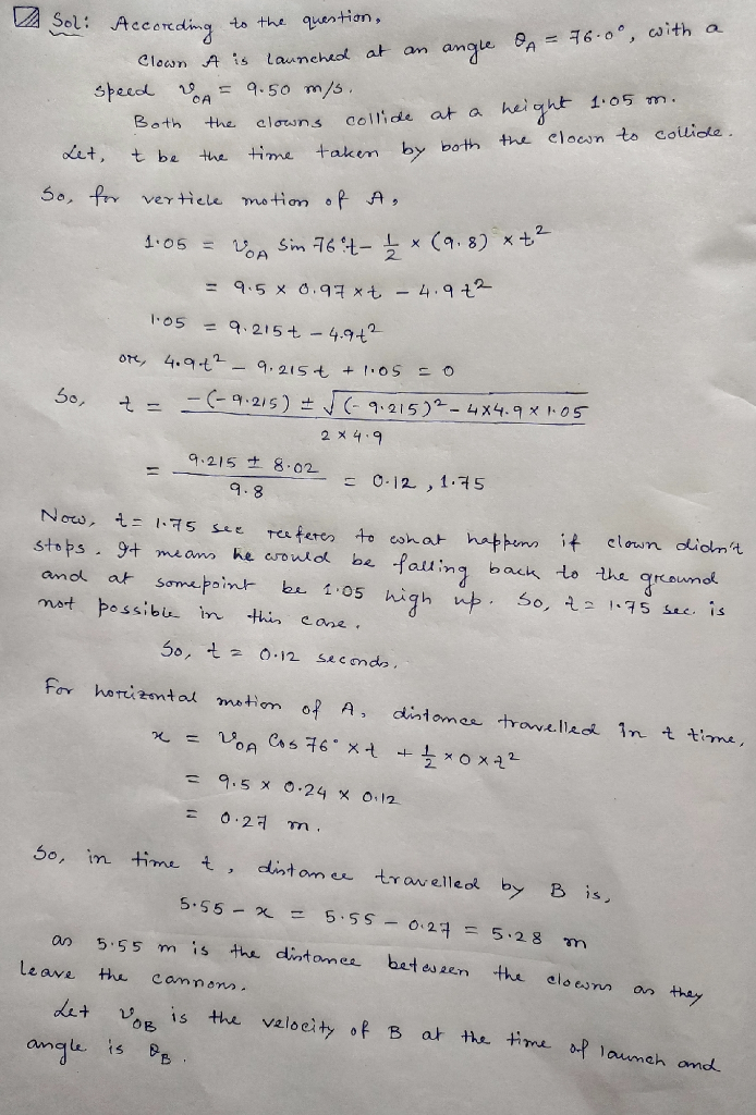 Two cannons are mounted as shown in the drawing and rigged to fire simultaneously. They are used in a circus act in which two clowns serve as human cannonballs. The clowns are fired toward each other and collide at a height of 1.05 m above the muzzles of the cannons. Clown A is launched at θA = 76.0° angle, with a speed v0A = 9.50 m /s. The horizontal separation between the clowns as they leave the cannons is d = 5.55 m. Find the launch speed v0B and the launch angle θB (>45.0°) for clown B. magnitude m/s direction °.