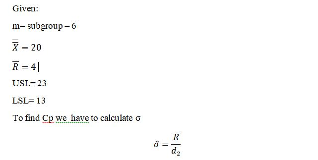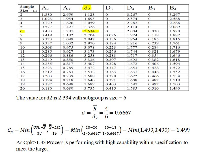 3. A pharmacy is using X bar and R charts to record the time it takes to fill a prescription after the customer has turned in or called in the prescription. Each day, the pharmacy records the times it takes to fill six prescriptions. During a 30-day period, the hospital obtained the following values: X double bar = 20 minutes; R bar = 4 minutes. The upper and lower specifications are 23 minutes and 13 minutes respectively. What is the value of Cpk, to two decimal places?