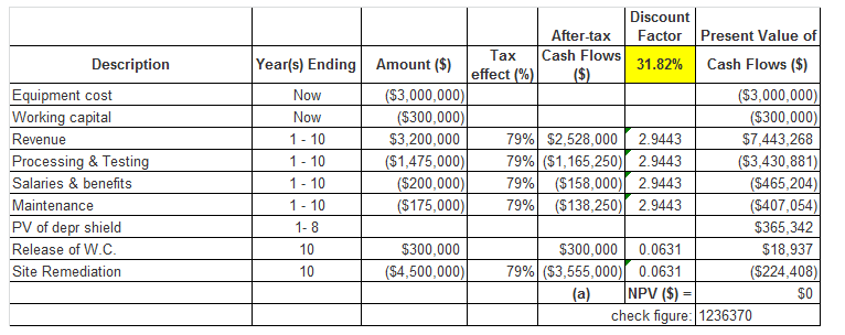 On use goal seek (SET CELL G12 for NPV equal to "0" - by changing after-tax discount rate CELL F2) we get IRR = 31.82%