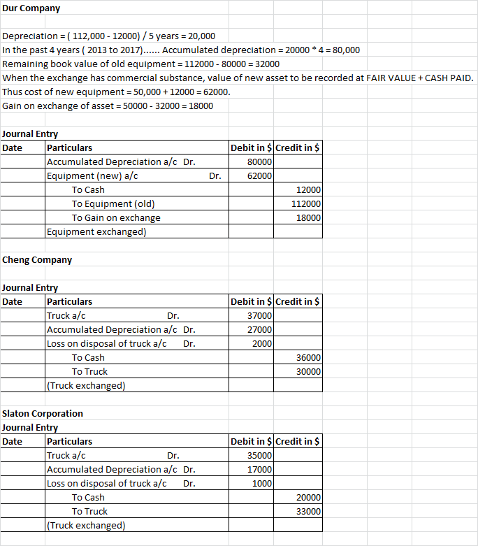 1) Dur Company purchased equipment on January 2, 2013, for $112,000. The equipment had an estimated useful life of 5 years with an estimated salvage value of $12,000. Dur uses straight-line depreciation on all assets. On January 2, 2017, Dur exchanged this equipment plus $12,000 in cash for newer equipment. The old equipment has a fair value of $50,000. (Assume that the exchange has commercial substance.)