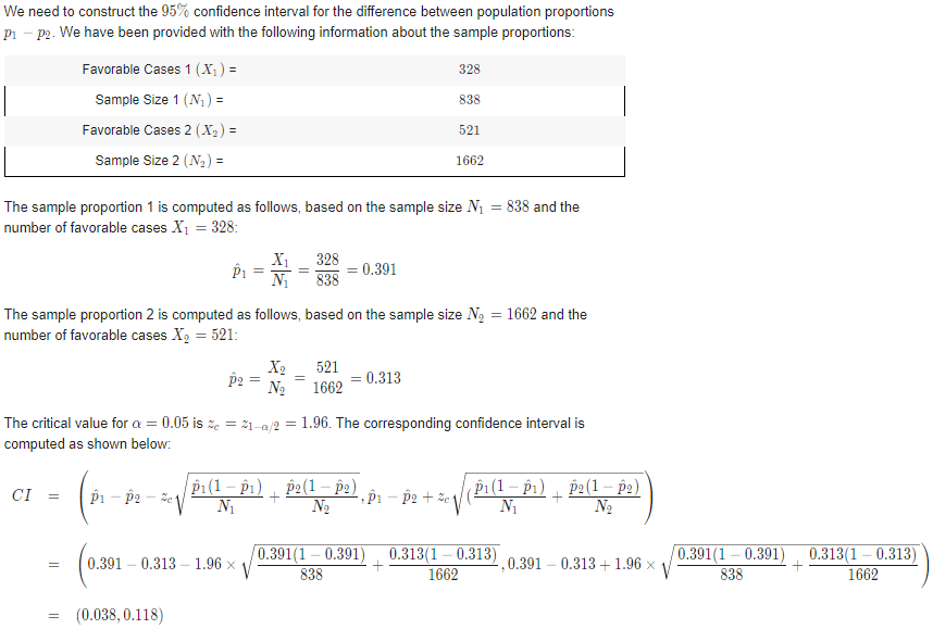 Based on the data provided, the 95% confidence interval for the difference between the population proportions of out of state speeding cars and in state speeding cars is 0.038<p<0.118, which indicates that we are 95% confident that the true difference between population proportions is contained by the interval (0.038,0.118).
