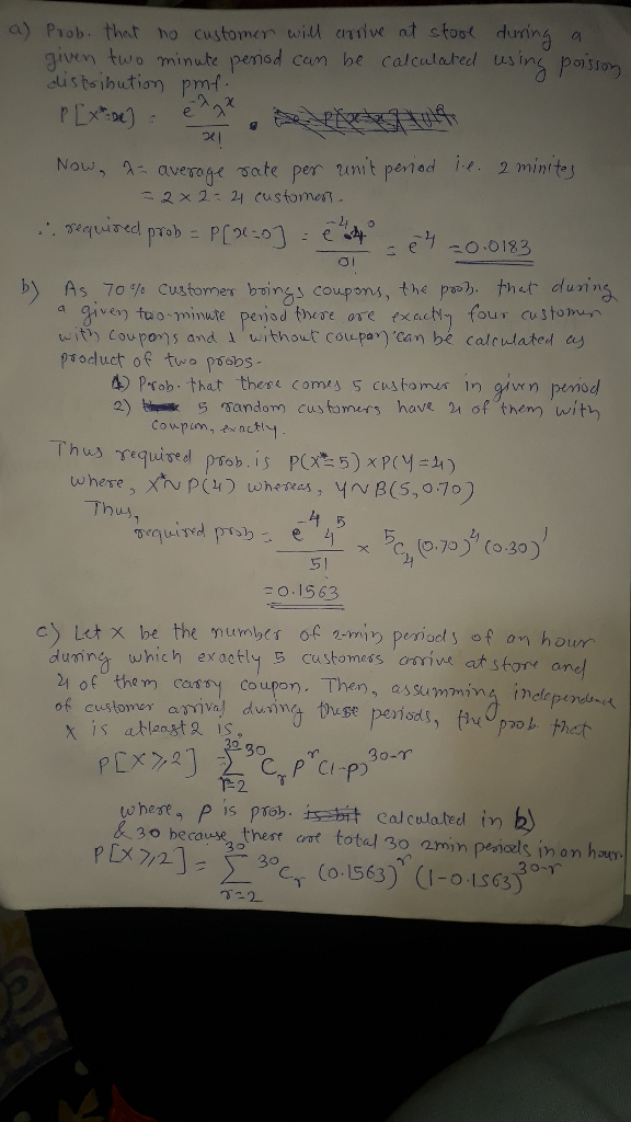 (b) Since it is a “Double Coupon” day at the store, approximately 70% of the customers coming to the store carry coupons. What is the probability that during a given two-minute period there are exactly four (4) customers with coupons and one (1) without coupons?