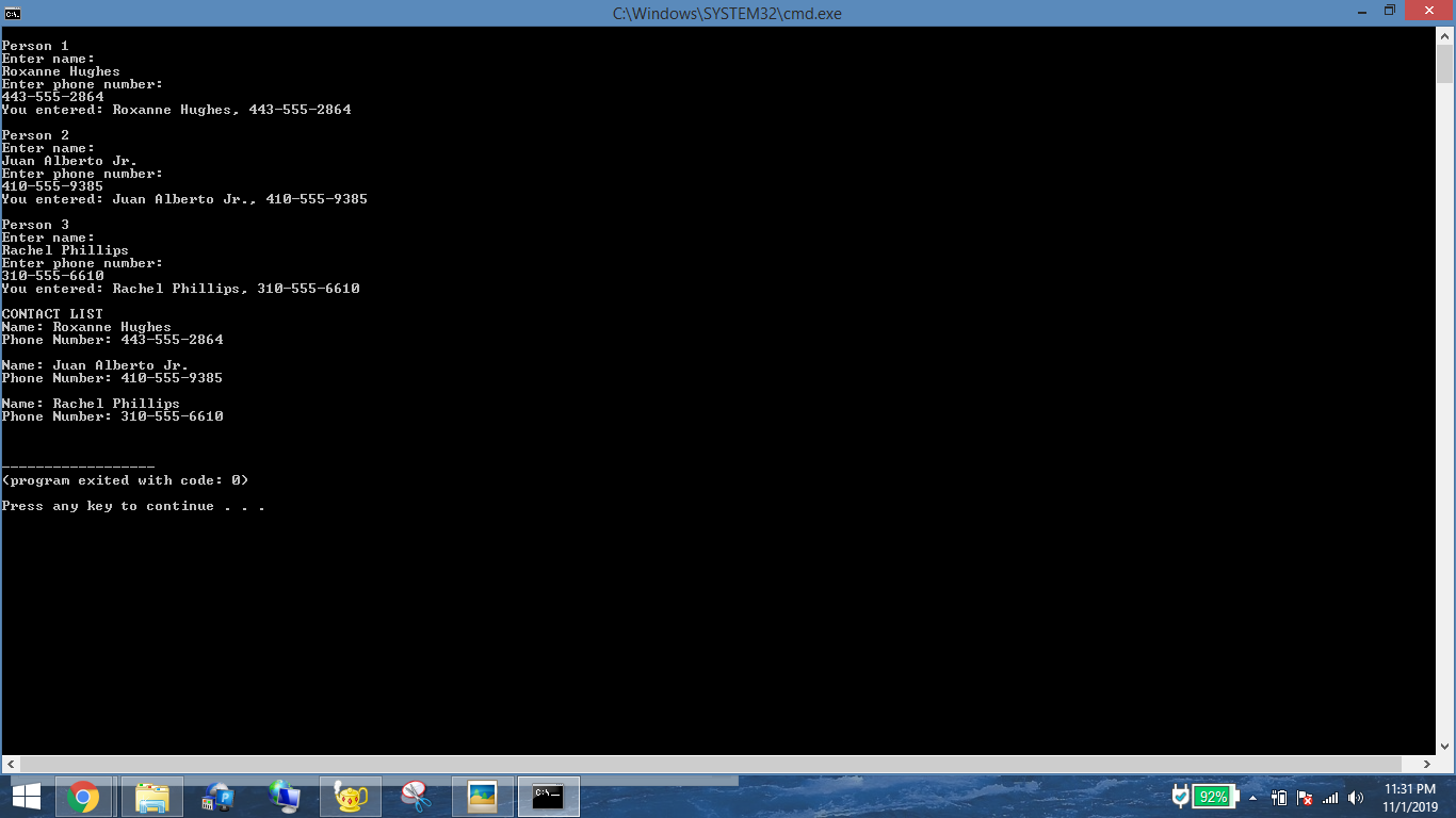 Person 1 Enter name: Roxanne Hughes Enter phone number: 443-555-2864 You entered: Roxanne Hughes, 443-555-2864 Person 2 Enter name: Juan Alberto Jr. Enter phone number: 410-555-9385 You entered: Juan Alberto Jr., 410-555-9385 Person 3 Enter name: Rachel Phillips Enter phone number: 310-555-6610 You entered: Rachel Phillips, 310-555-6610