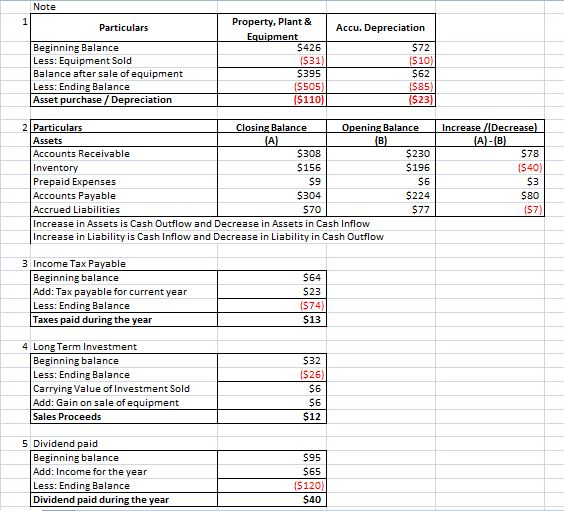 2. Using the information in (1) above, along with an analysis of the remaining balance sheet accounts, prepare a statement of cash flows for this year. (List any deduction in cash and cash outflows as negative amounts.)
