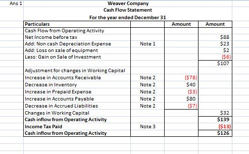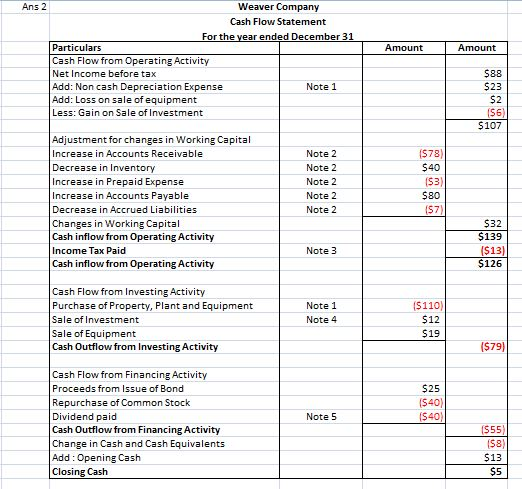 During this year, Weaver sold some equipment for $19 that had cost $31 and on which there was accumulated depreciation of $10. In addition, the company sold long-term investments for $12 that had cost $6 when purchased several years ago. Weaver paid a cash dividend this year and the company repurchased $40 of its own stock. This year Weaver did not retire any bonds.