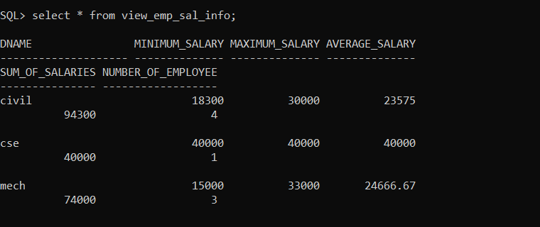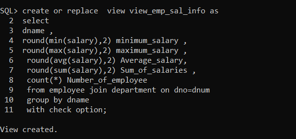 Calculate the following: The minimum, average, maximum, and sum of all salaries, and a count to show the records used. Have the calculations grouped by department name. (You will need to join with the departments table.) Round the functions to two decimal points. Give the read only constraint the name of vw_emp_sal_info_readonly.