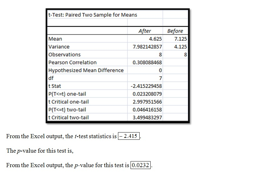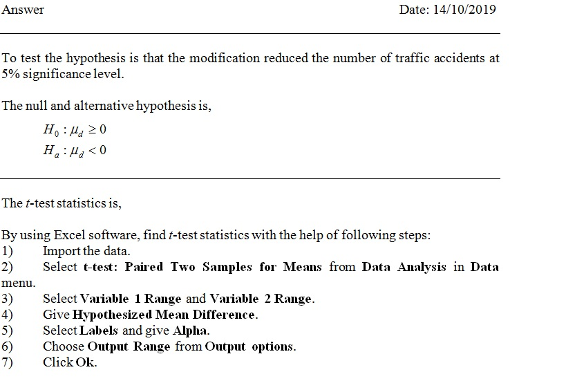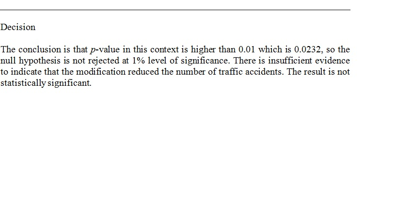 7. A number of minor automobile accidents occur at various high-risk intersections in Teton County despite traffic lights. The Traffic Department claims that a modification in the type of light will reduce these accidents. The county commissioners have agreed to a proposed experiment. Eight intersections were chosen at random, and the lights at those intersections were modified. At the .01 significance level, is it reasonable to conclude that the modification reduced the number of traffic accidents?