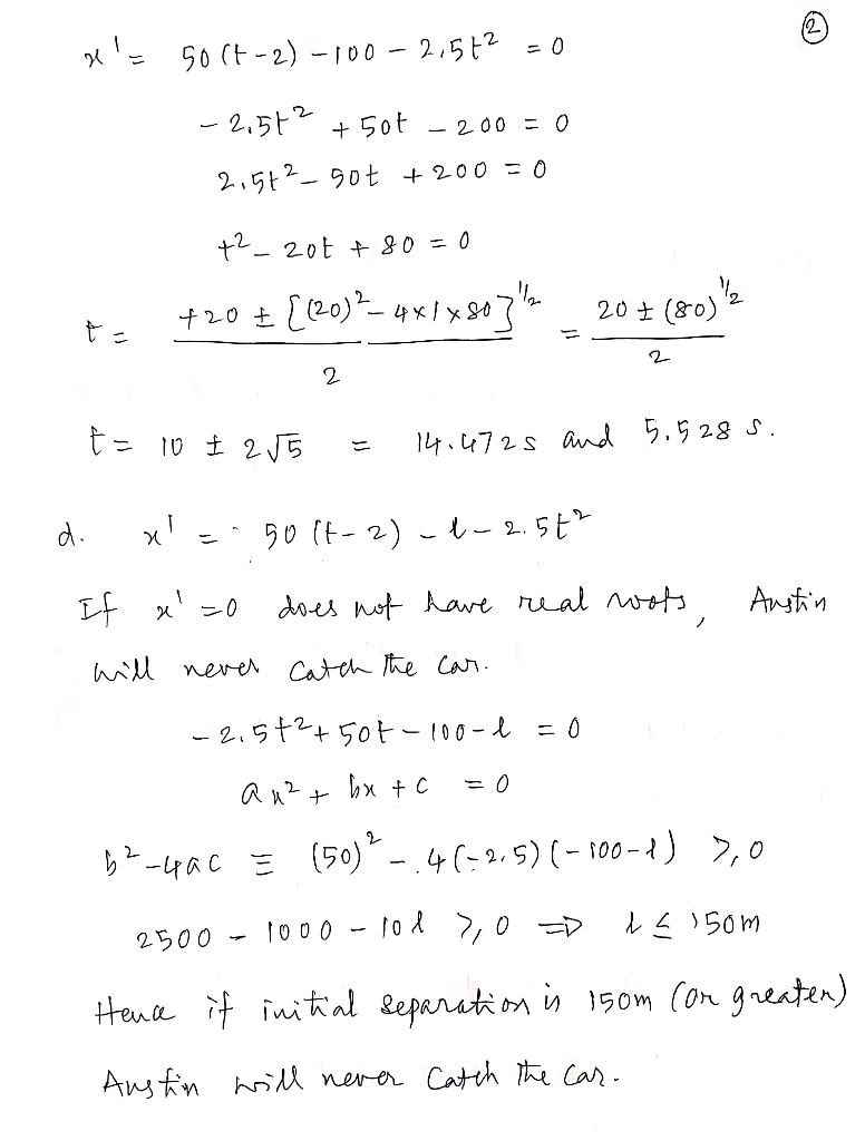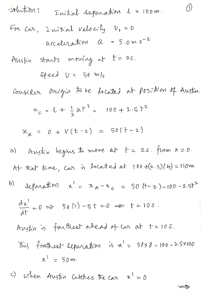 In the television show “The Six Million Dollar Man”, Colonel Austin had superhuman powers. In one episode, he tries to catch a man fleeing in a sports car. We’ll assume in this problem that the distance between them at t=0 is 100 m. The car starts at rest. At t = 0.0 s, the driver notices Colonel Austin. From then on, the car accelerates at 5.0 m s -2 , away from Austin. Sweet, but a bit slow on the uptake, Colonel Austin remains motionless until t = 2.0 s, at which point he begins his pursuit, at a constant speed of 50 m/s. a) How far ahead is the car when Colonel Austin begins to move? b) At what time (t>0) is Austin furthest ahead of the car? And what is that separation? c) At what time(s) does Austin catch the car? d) What is the critical initial separation (all other parameters remaining the same) beyond which Colonel Austin will never catch the car?