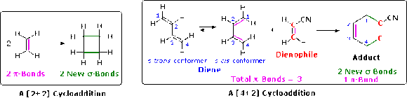 The unique character of conjugated dienes manifests itself dramatically in the Diels-Alder Cycloaddition Reaction. A cycloaddition reaction is the concerted bonding together of two independent pi-electron systems to form a new ring of atoms. When this occurs, two pi-bonds are converted to two sigma-bonds, the simplest example being the hypothetical combination of two ethene molecules to give cyclobutane. This does not occur under normal conditions, but the cycloaddition of 1,3-butadiene to cyanoethene (acrylonitrile) does, and this is an example of the Diels-Alder reaction. The following diagram illustrates two cycloadditions, and introduces several terms that are useful in discussing reactions of this kind.