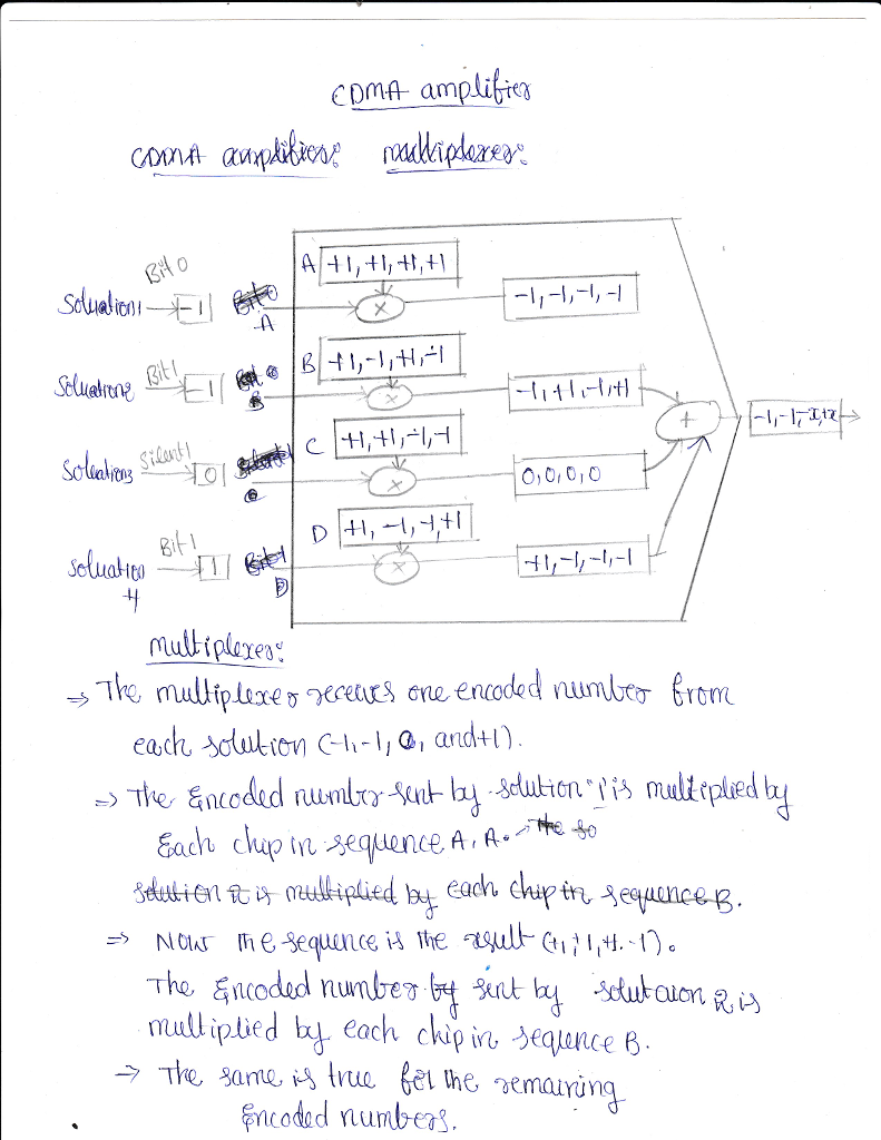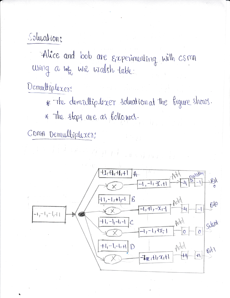 Alice and Bob are experimenting with CSMA using a W2 Walsh table. Alice uses the code [+1, +1] and Bob uses the code [+1, −1]. Assume that they simultaneously send a hexadecimal digit to each other. Alice sends (6)16 and Bob sends (B)16. Show how they can detect what the other person has sent.