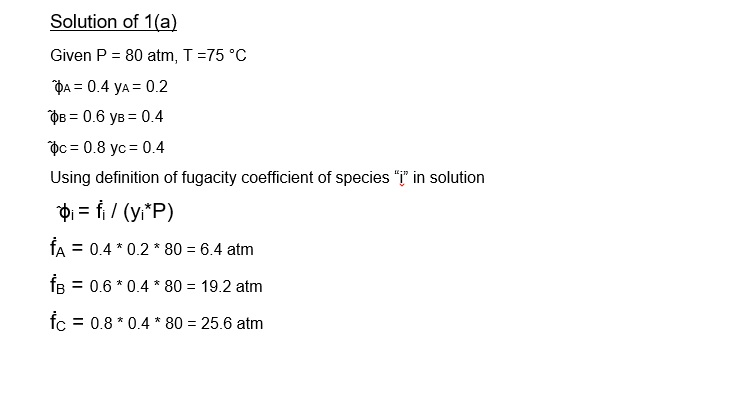 1a. A ternary mixture contains 20 mol % A , 40mol % B, and 40 mol % C. At a pressure of 80 atm and a temperature of 75?C the fugacity coefficient of components A ,B and C in this mixture are 0.4, 0.6 and 0.8 respectively. What is the fugacity of the mixture?
