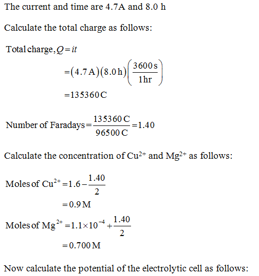 A battery is constructed based on the oxidation of magnesium and the reduction of Cu2+. The initial concentrations of Mg2+ and Cu2+ are 1.1×10−4 M and 1.6 M , respectively, in 1.0-liter half-cells.