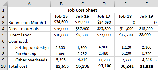 Jobs 15, 16, and 17 have been completed and sold in March. Therefore, work in process on March 31 will contain only Jobs 18 and 19.