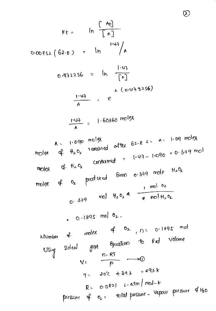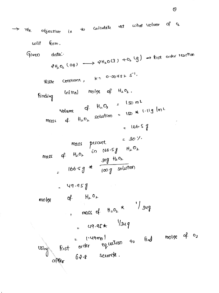 The reaction 2H2O2(aq)→2H2O(l)+O2(g)2H2O2(aq)→2H2O(l)+O2(g) is first order in H2O2H2O2 and under certain conditions has a rate constant of 0.00752 s−1s−1 at 20.0 ∘C∘C. A reaction vessel initially contains 150.0 mLmL of 30.0% H2O2H2O2 by mass solution (the density of the solution is 1.11 g/mLg/mL). The gaseous oxygen is collected over water at 20.0 ∘C∘C as it forms.