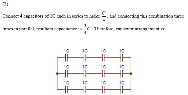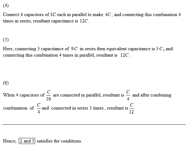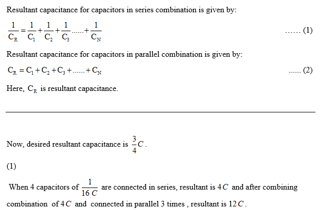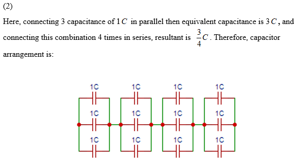 Design a combination of identical capacitors, each with capacitance C, for which the equivalent capacitance is 3C/4. (Select all that apply.) 1.Make 4C capacitors by combining four capacitors in series; then combine three of these in parallel. 2.Connect three capacitors in parallel to obtain an equivalent capacitance of 3C; then connect four of these new capacitors in series. 3. Make C/4 capacitors by combining four capacitors in series; then combine three of these in parallel. 4. Connect four capacitors in parallel to obtain an equivalent capacitance of 4C; then connect four of these new capacitors in series. 5.Connect three capacitors in series to obtain an equivalent capacitance of 3C; then connect four of these new capacitors in parallel. 6. Make C/4 capacitors by combining four capacitors in parallel; then combine three of these in series. Select which numbers of 1-6 would work for an equivalent capacitance of 3C/4