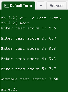 Write a program that prompts the user to enter five test scores and then print the average test score to the screen. (Assume that the test scores are decimal numbers). Use the following 5 numbers: 10.5 5.5 20.0 10.0 5.5.