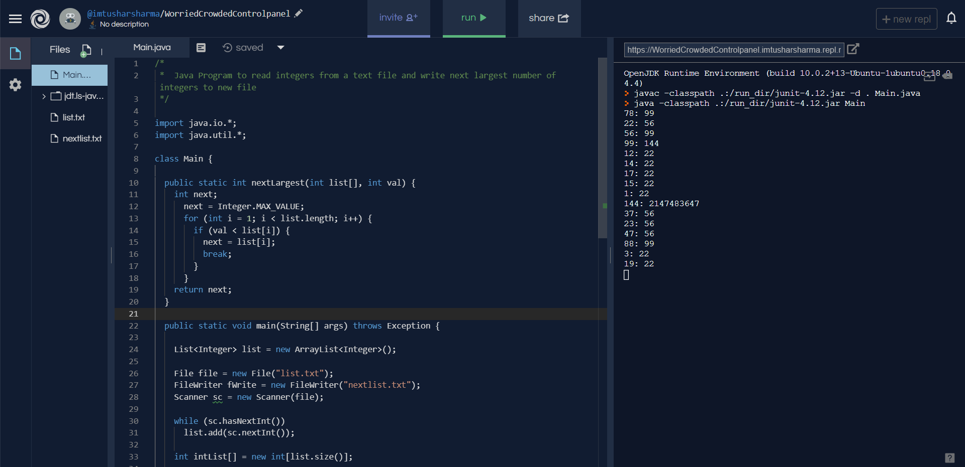 Write a Java program called Numbers that reads a file containing a list of numbers and outputs, for each number in the list, the next bigger number. For example, if the list is