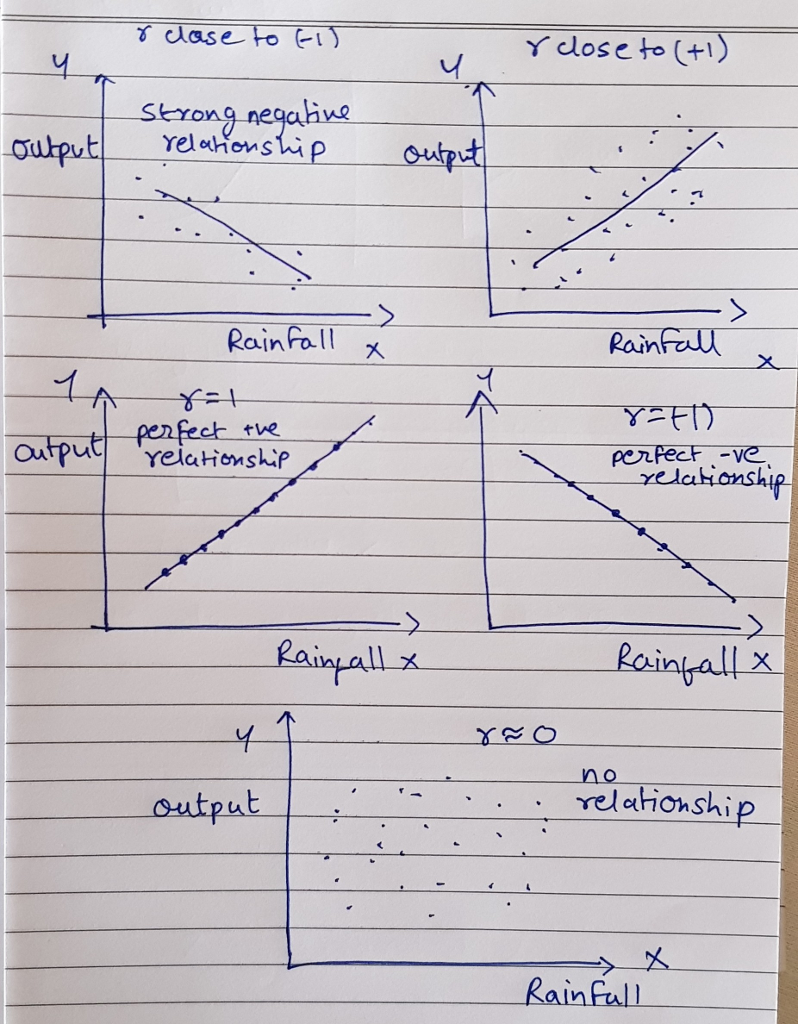 Correlation, on the other hand, gives us the strength of the relationship between the variables. In our example, it would give us an idea of how close is output dependent on rainfall. Correlation is measured using the correlation coefficient and its value ranges from -1 to 1.