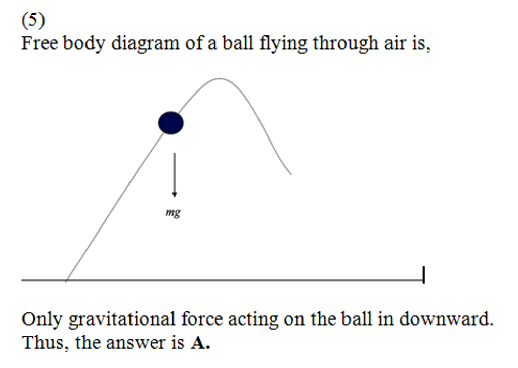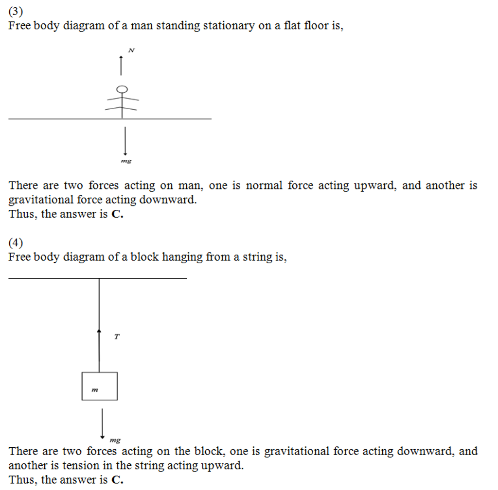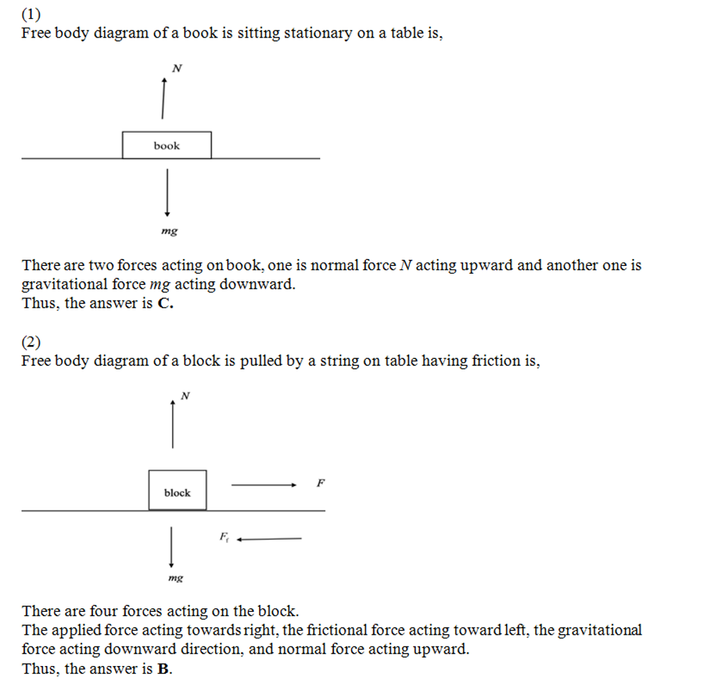 A free-body diagram is a major tool we use to help analyze problems involving forces. To create a free-body diagram, place a dot on the paper to represent the object (or objects) of interest and then draw all of the forces acting on that body. The force vectors are drawn with their tail on the dot. A major step in any of our force problems is correctly identifying all of the forces acting on an object. There are three possible free-body diagrams shown at the top of the problem. Select the appropriate free-body diagram for each of the situations listed below. If there are two items mentioned, select the free-body diagram for the first object mentioned (book, block, you, ball).