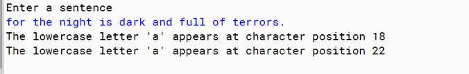 System.out.println("The lowercase letter 'a' appears at character position "+i);