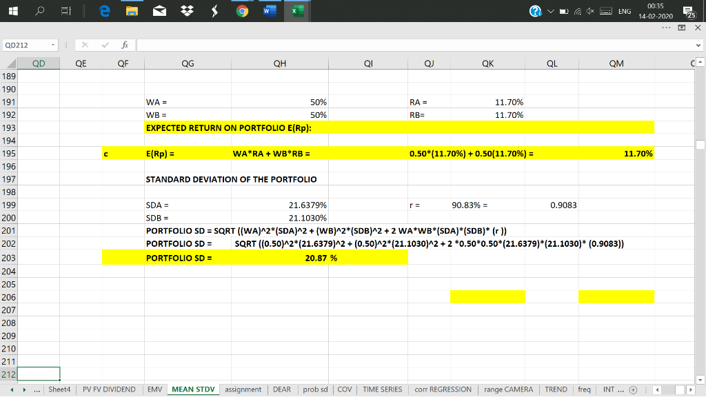 (b) Assume that someone held a portfolio consisting of 50% of stock A and 50% of stock B and that the average annual realized returns and past volatility of each stock are unbiased estimators of their expected returns and future volatility. What is the portfolio's expected return and the volatility of next year's returns (as percents)? The correlation between the returns of the two stock is 90.83%. (Round your answers to two decimal places.)