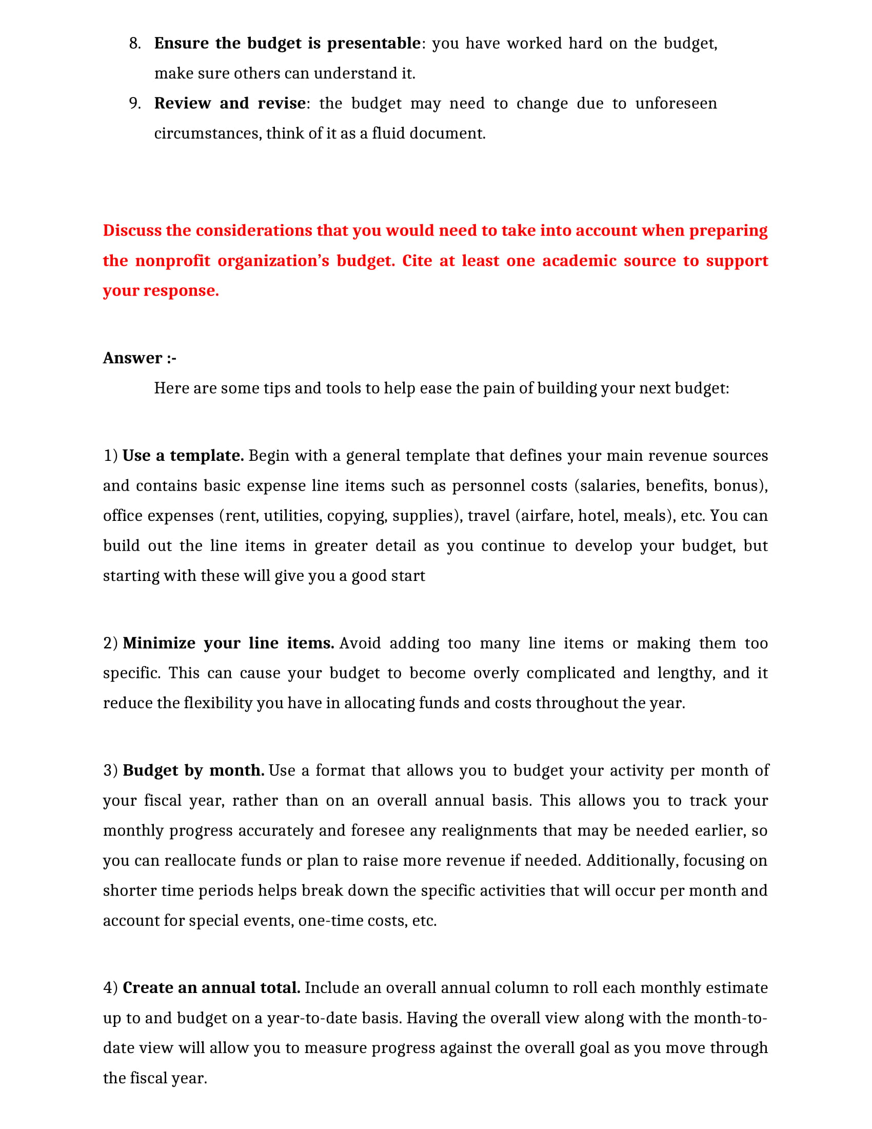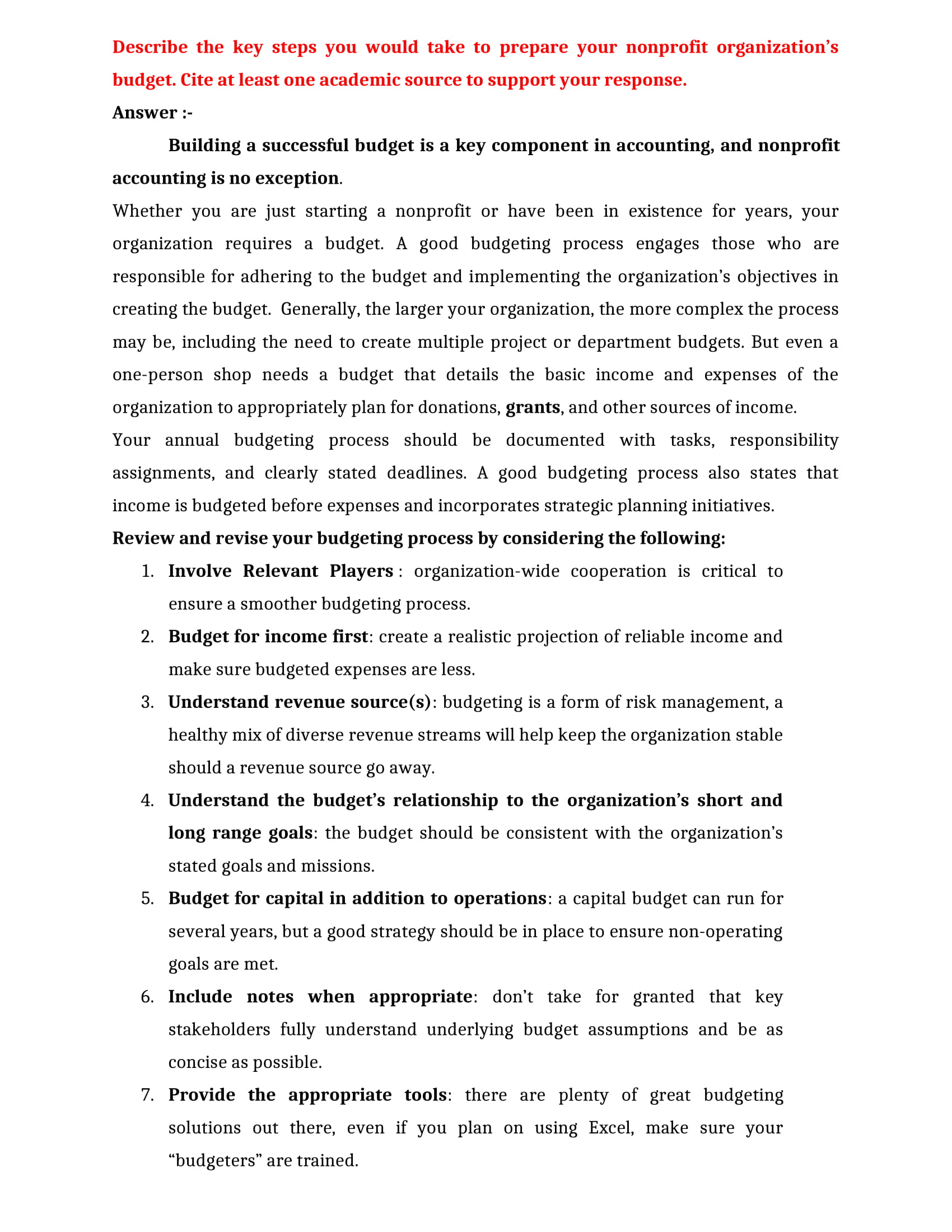 o Describe the key steps you would take to prepare your nonprofit organization’s budget. Cite at least one academic source to support your response.