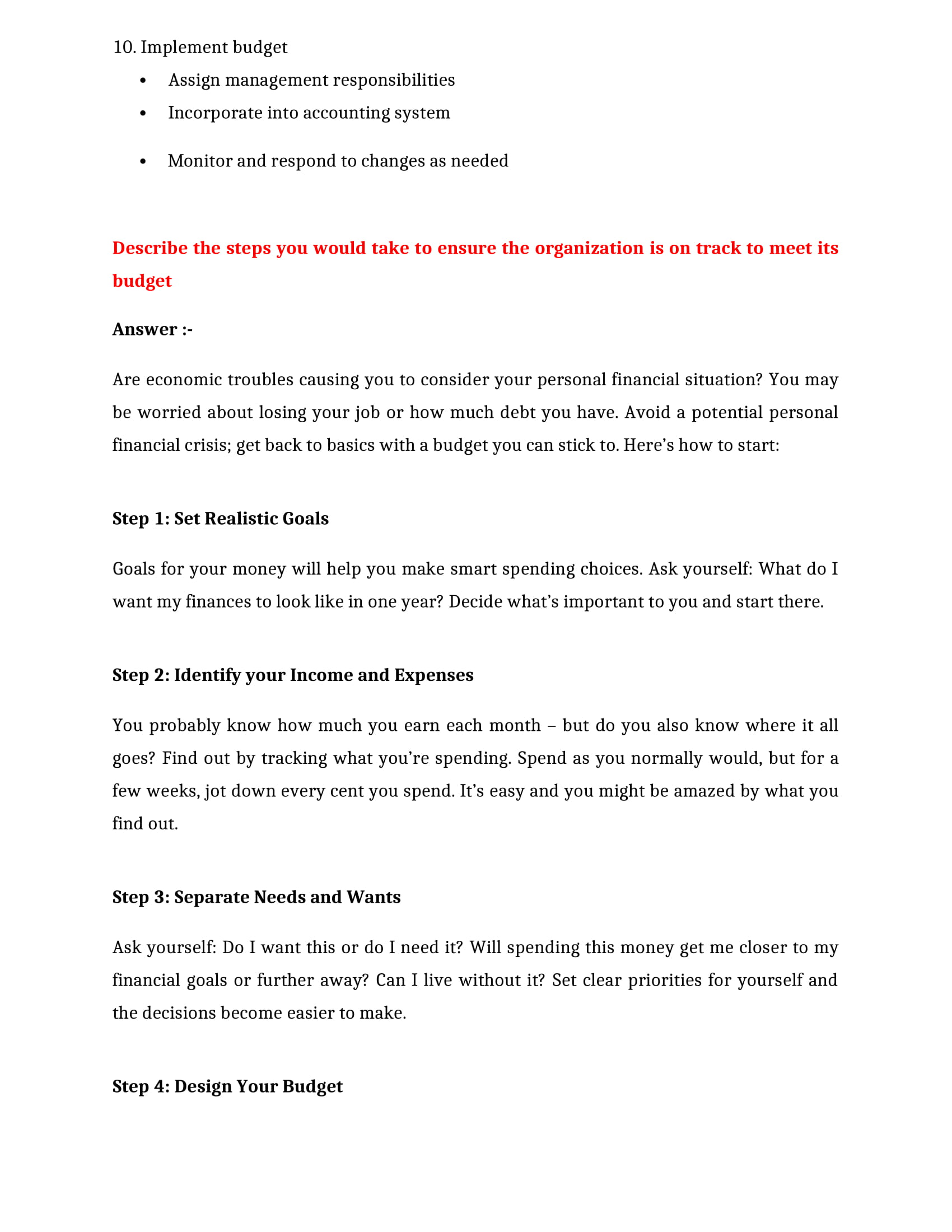 o Describe the steps you would take to ensure the organization is on track to meet its budget.