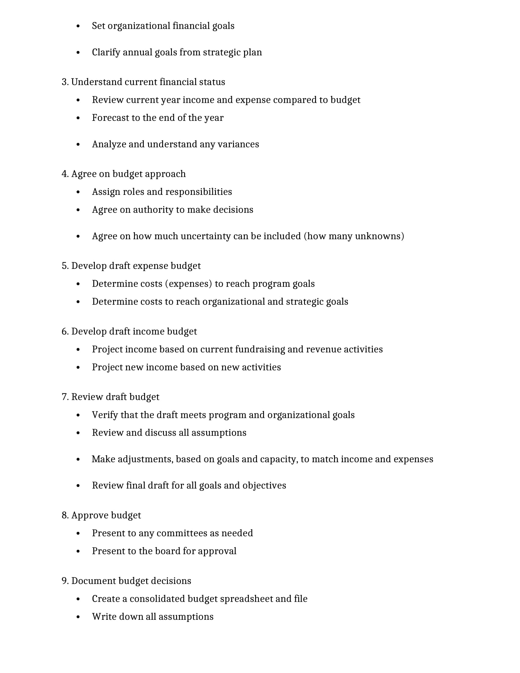 You are a nonprofit manager and you are preparing for the upcoming fiscal year. You are in charge of leading the budget process for the organization. Briefly describe how you would start to prepare the organization’s budget. What considerations would you need to take into account? Who would you involve in the process? What are the timeline and key activities of the budget process? Once your budget is developed, what steps would you take to ensure the organization is on track to meet its budget?