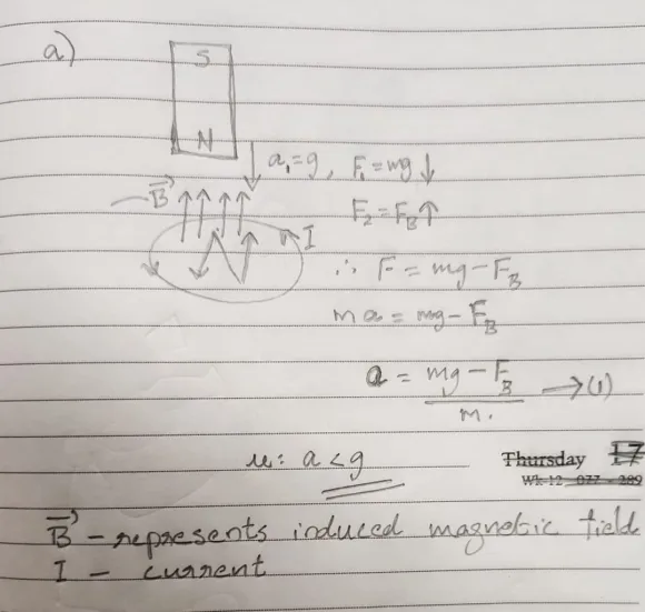 3)Repulsive force opposes the weight of magnet and hence resultant force on magnet will come down so it is decelerated. Mathematical steps are there in image (a). There I proved a<g.