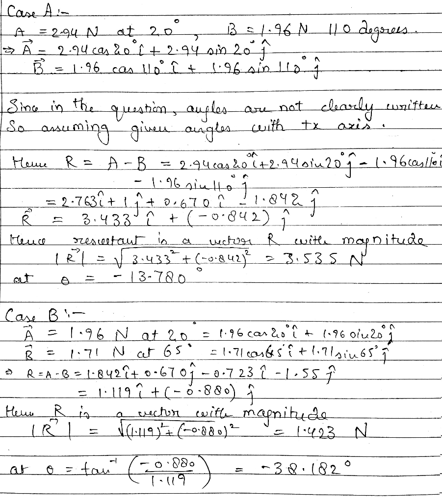 CASE A: Vector A: 2.94N at 20 degrees Vector B: 1.96N at 110 degrees.
