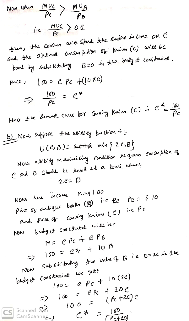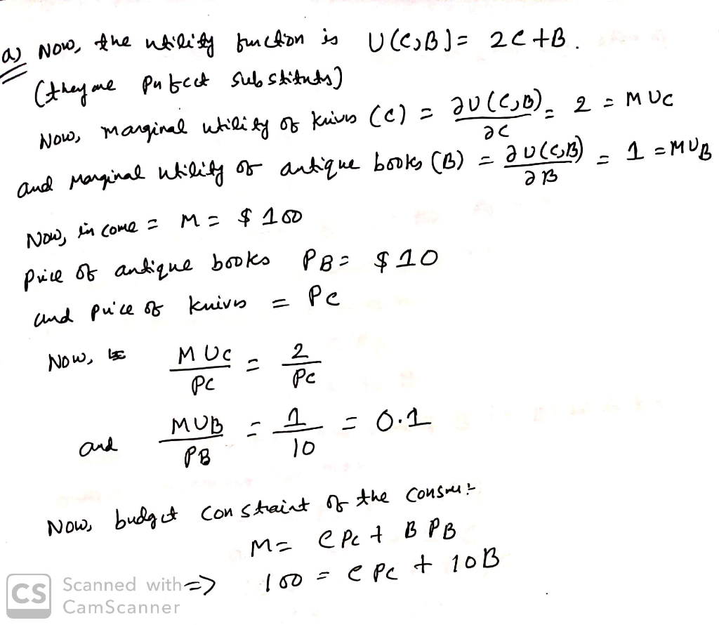a. Josiah Bartlett collects 2 goods, carving knives (C) and antique books (B). His utility function is U(C, B) = 2C + B (they are perfect substitutes). Find Josiah’s demand curve for carving knives if he has $100 to spend and the price of antique books is $10.