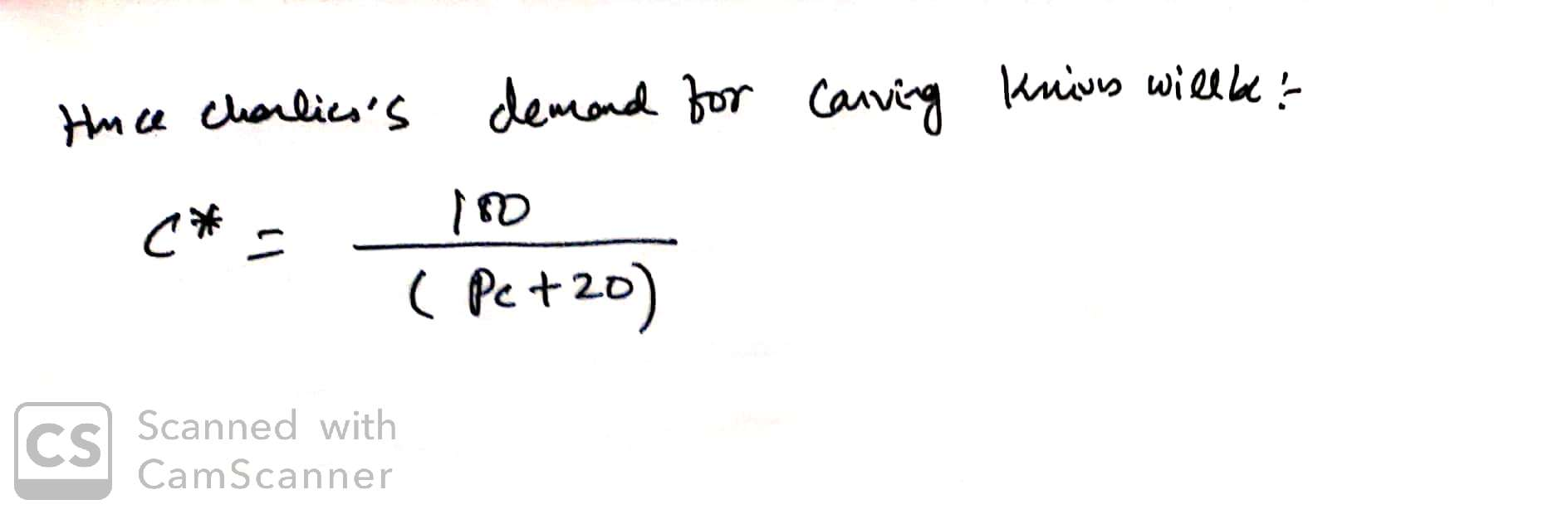 b. Josiah's assistant Charlie collects the same two goods but has a different utility function: U(C, B) = min{2C, B} (they are perfect complements). Find Charlie’s demand curve for carving knives if he has $100 to spend and the price of antique books is $10.