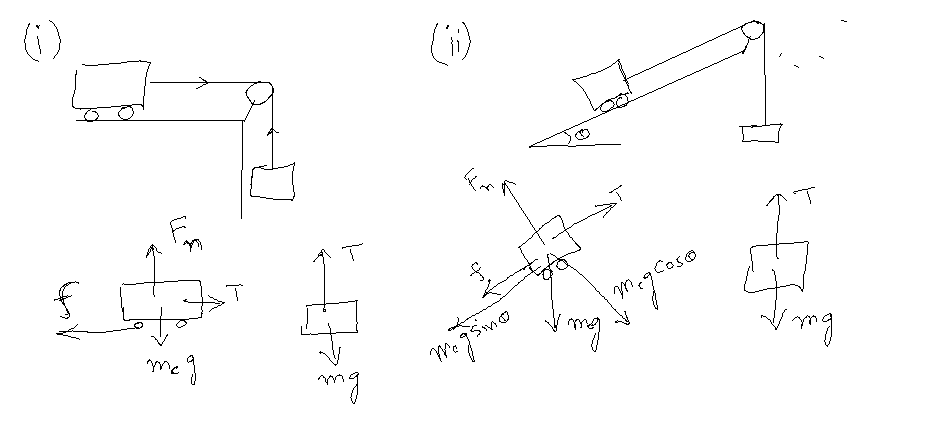 A cart is attached to a hanging mass by a string that passes over a pulley. a) Draw free-body diagrams for the cart and the hanging mass (Clearly label all forces present and indicate their relative magnitudes) when the cart is moving:(i) on a horizontal track.(ii) up a track inclined at an angle .b) When the cart moves on an incline at constant speed, it is in equilibrium; i.e., the net force on it is zero. Does it require more, less, or the same tension in the string to pull the cart up the track at constant speed or down the track at constant speed? Explain your answer.c)Derive an equation for the work done by friction when the cart is moving up the track at constant speed. Show your work.