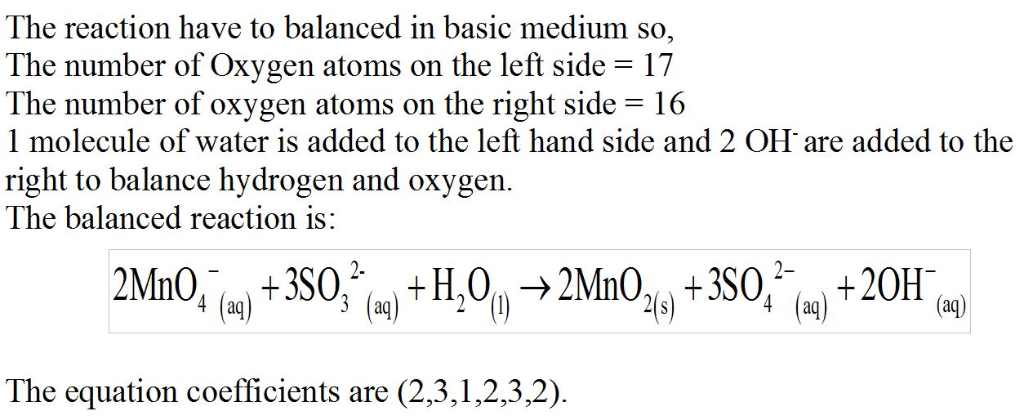 KMnO4, is a powerful oxidizing agent. The products of a given redox reaction with the permanganate ion depend on the reaction conditions used. In basic solution, the following equation represents the reaction of this ion with a solution containing sodium sulfite: