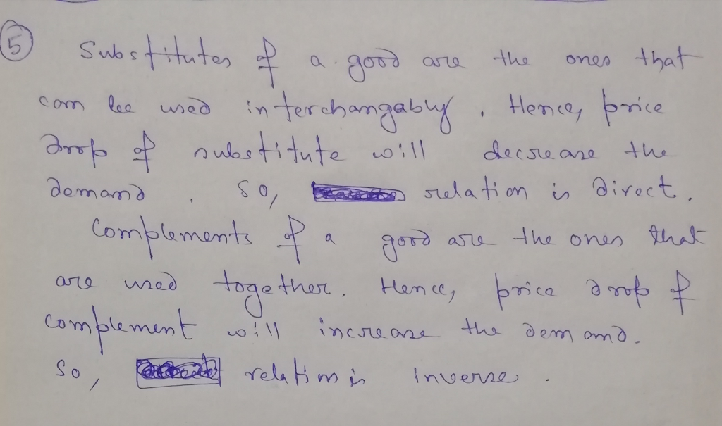 B) directly with the prices of substitutes and inversely with the prices of complements.