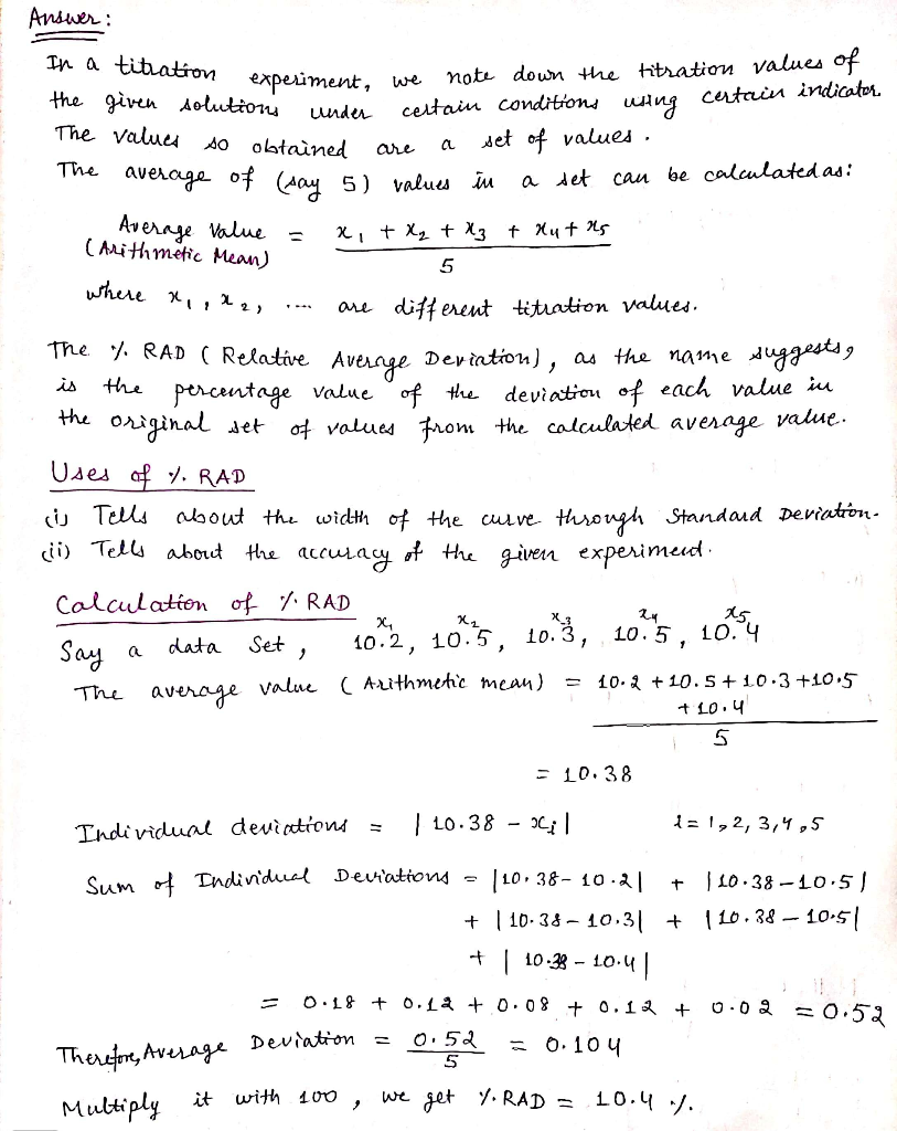 The set of values are used to find the arithmetic mean and then that mean is used to calculate the standard deviation of the values. Which then leads to the Relative Average Deviation, and multiplied with 100 gives a % form of RAD. The detailed solution is given below:
