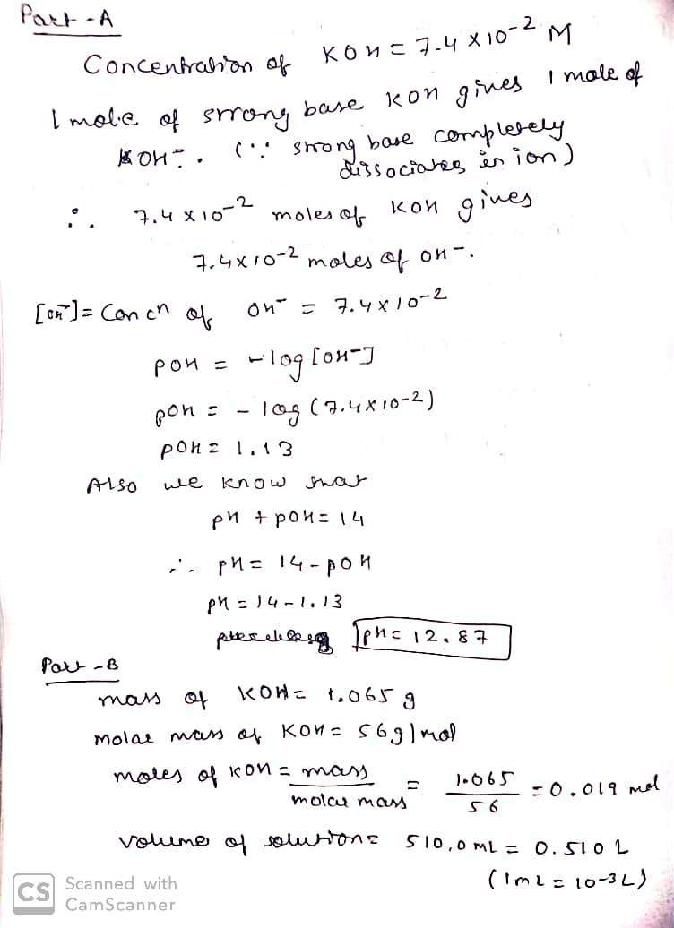 Calculate pH for strong base solution: 7.4×10−2 M KOH.