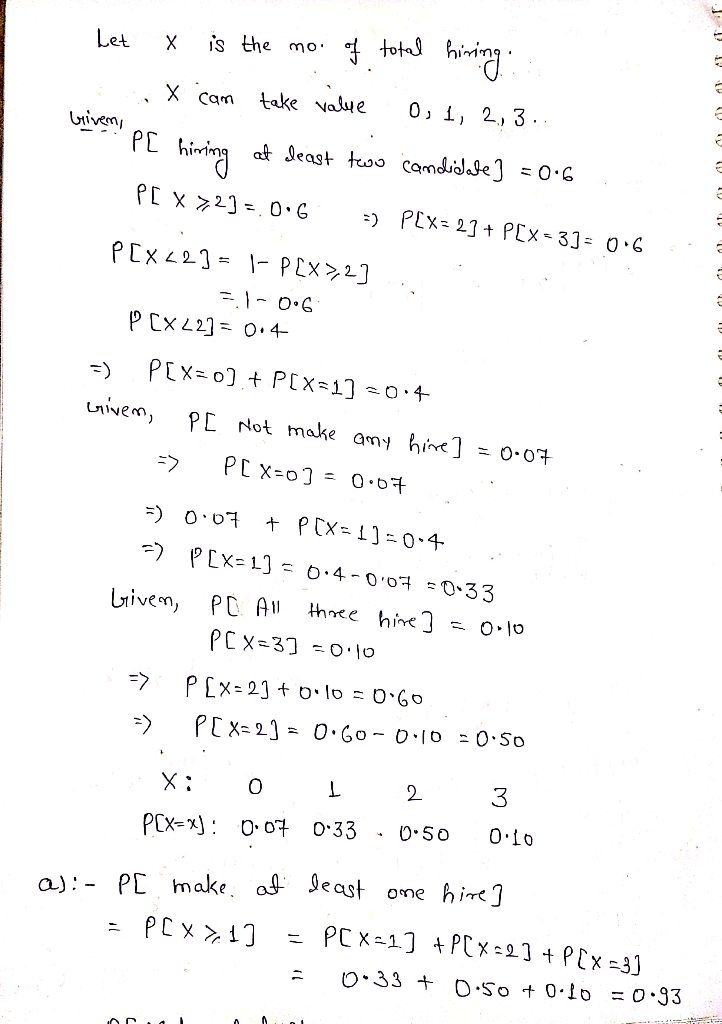 A marketing firm is considering making up to three new hires. Given its specific needs, the management feels that there is a 60% chance of hiring at least two candidates. There is only a 7% chance that it will not make any hires and a 10% chance that it will make all three hires.