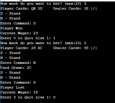cout << "\tDealer Cards: " << Dealer[dealerInd-1] << " |/|" << endl;
