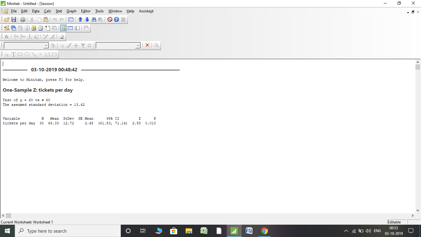 conclusion : As P-value =0.01 <alpha=0.05 we reject the null hypothesis and claim that The Kaiserslautern police department doesn't issue an average of 60 parking tickets per day i.e mu not equals to 60
