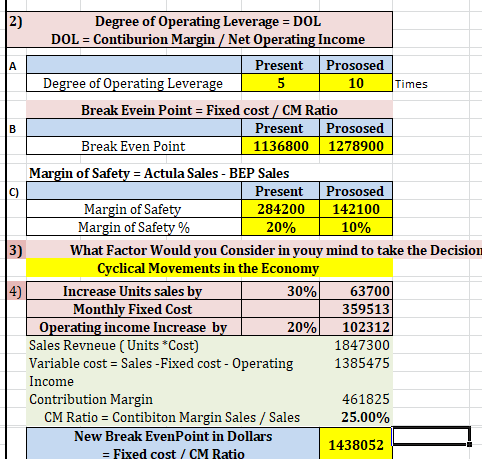 2. Refer to the income statements in (1). For the present operations and the proposed new operations, compute (a) the degree of operating leverage, (b) the break-even point in dollar sales, and (c) the margin of safety in dollars and the margin of safety percentage.