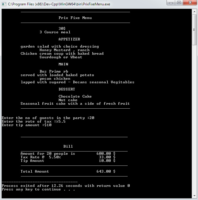 Write a complete C++ program that prompts the user for the price of the prix fixe menu choice. The program should then prompt the user for the number of guests in the party. The program should then calculate the bill including tax and tip then print the results to the console in the form of a receipt
