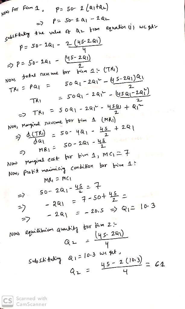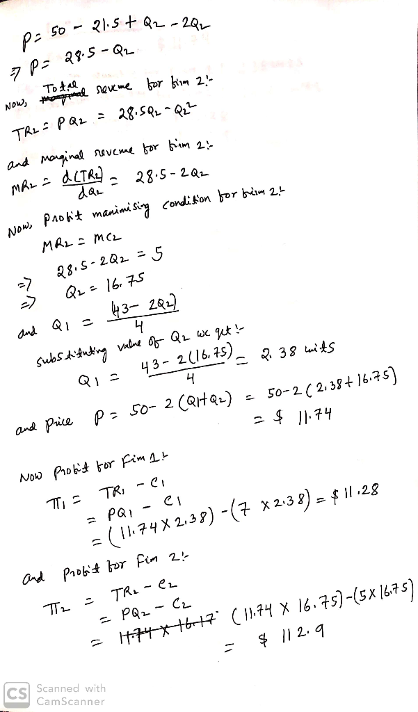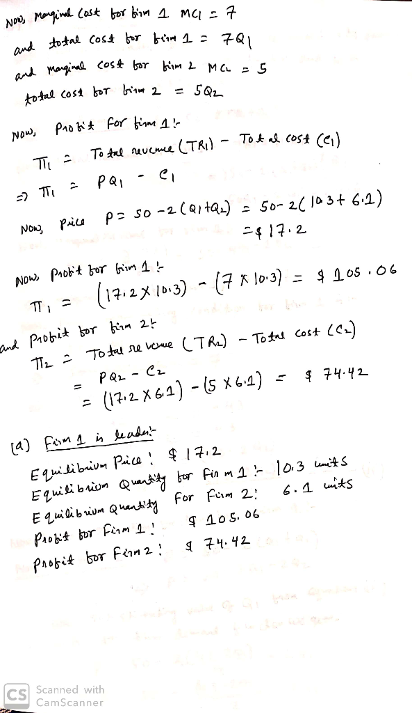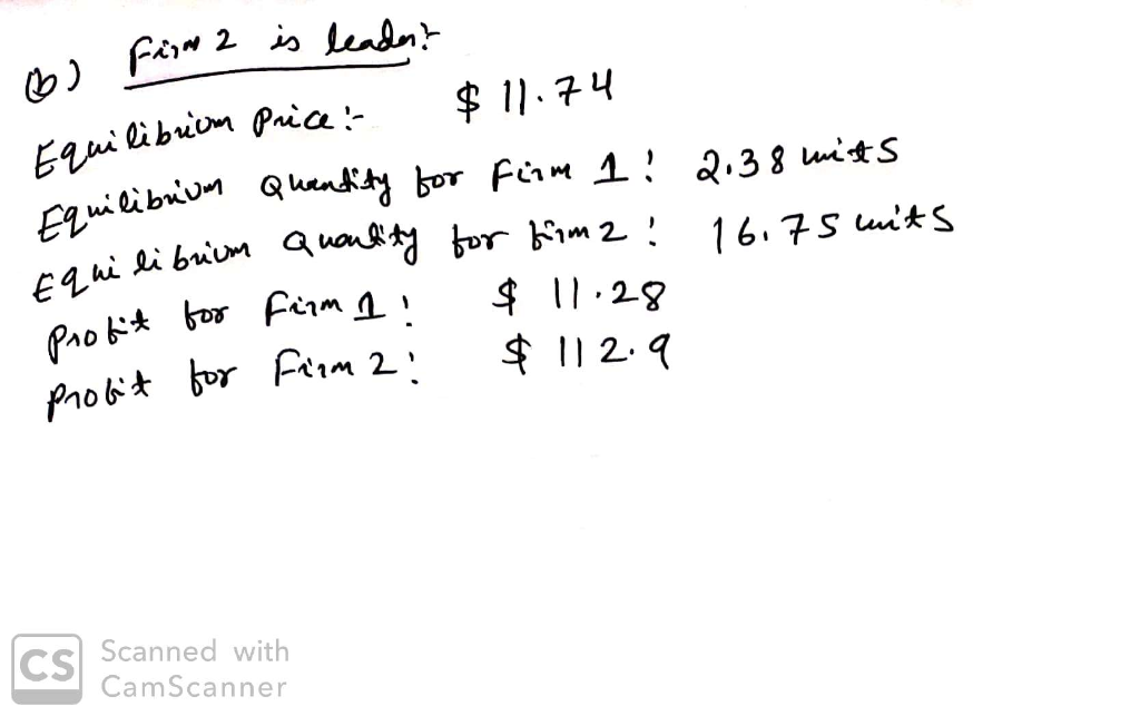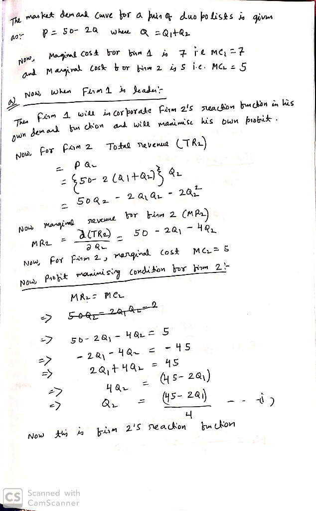 The market demand curve for a pair of duopolists is given as P=50- 2Q where Q= Q1+ Q2. The constant per unit marginal cost is 7 for firm 1 and 5 for firm 2. Both firms also have no fixed costs. Find the equilibrium price, quantity and profit for each firm if firm 1 is the Stackelberg leader and firm 2 a follower. Now re-do the computations assuming that firm 2 is the leader and firm 1 the follower.