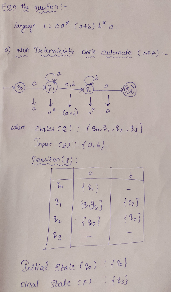 Consider the language L over alphabets (a, b) that produces strings of the form aa* (a + b) b*a.