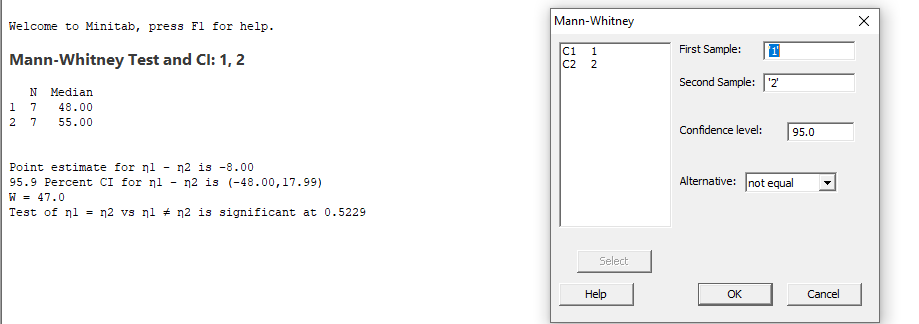 2. steps in minitab to perform the test : stat,non parametric, Mann-Whitney