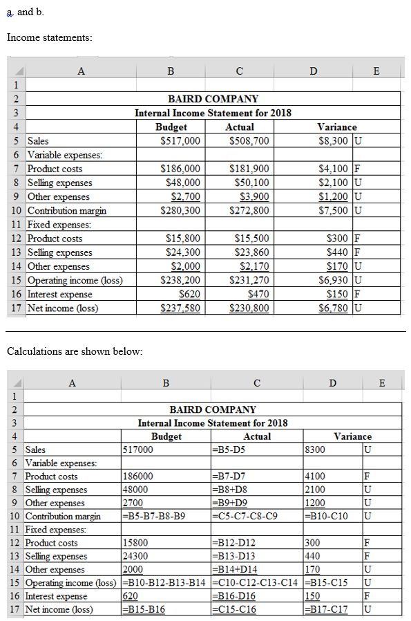 Baird Company has provided the following 2018 data: Budget Sales $ 517,000 Variable product costs 186,000 Variable selling expense 48,000 Other variable expenses 2,700 Fixed product costs 15,800 Fixed selling expense 24,300 Other fixed expenses 2,000 Interest expense 620 Variances Sales 8,300 U Variable product costs 4,100 F Variable selling expense 2,100 U Other variable expenses 1,200 U Fixed product costs 300 F Fixed selling expense 440 F Other fixed expenses 170 U Interest expense 150 F Required a. & b. Prepare a budgeted and actual income statement for internal use. Separate operating income from net income in the statements. Calculate variances and identify them as favorable (F) or unfavorable (U) by comparing the budgeted and actual amounts determined. (Select "None" if there is no effect (i.e., zero variance).)