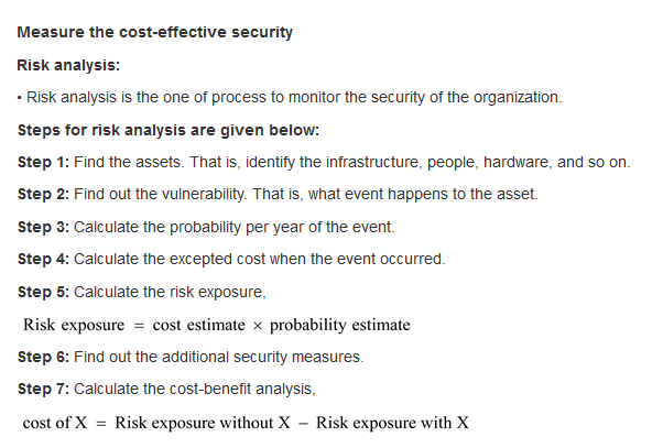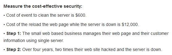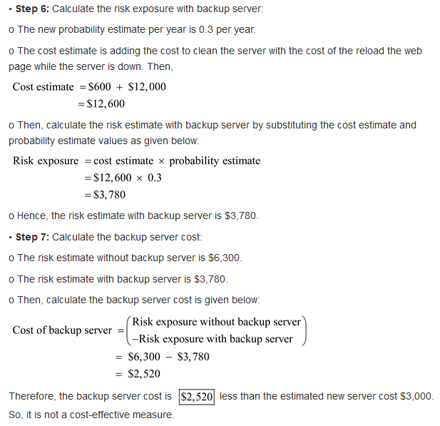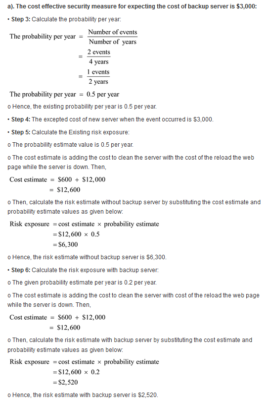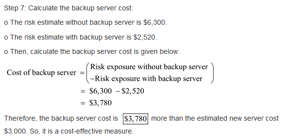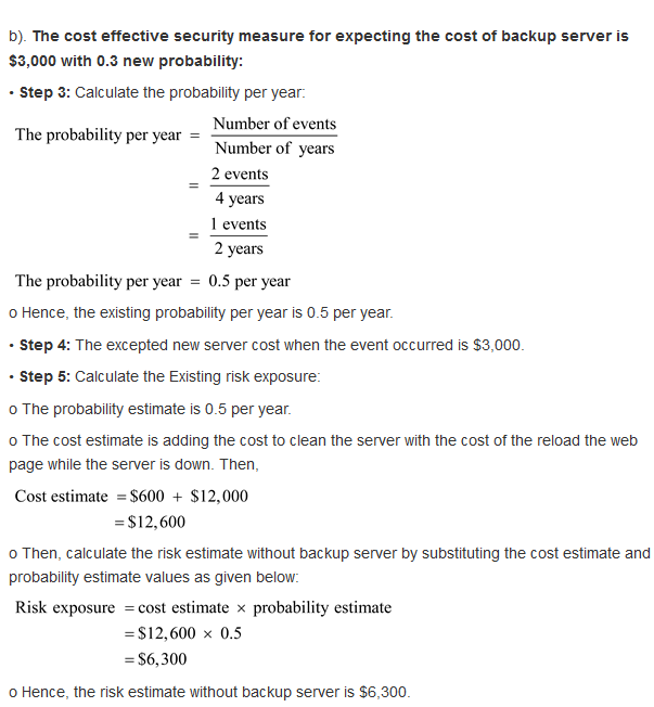 You could purchase a backup server for a cost of $3,000, which you estimate would reduce the probability per year of losing your website to 0.2. Would this be a cost- effective security measure?