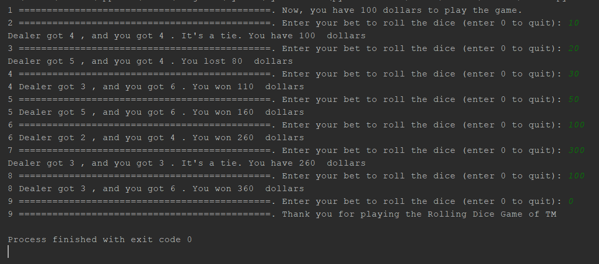 2 =============================================. Enter your bet to roll the dice (enter 0 to quit): 10 Dealer got 1 , and you got 5 . You won 10 dollars. Now, you have 110 dollars.
