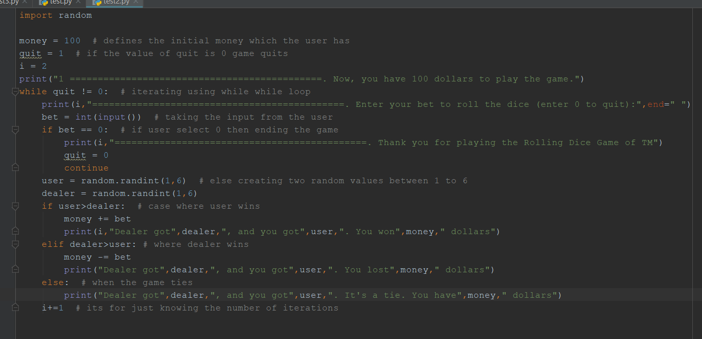 Please write a Python program to let you or the user play the game of rolling a dice and winning/losing money. Initially, you have 100 dollars in your account. You place a bet to roll the dice. The game will be stopped if your bet is zero. First, dealer would roll the dice and get a number from random.randint(1, 6). Then, you would roll the dice and get a number from random.randint(1, 6). Now, compare your number with dealer’s number to see whether you won or lose the bet. If you lose, the bet would be deducted from your account. If you won, the bet would be added to your account. If it’s a tie, your account is not touched. Then, continue the game of putting your bet until your bet is zero. The game is to continue even when you have zero or negative amount of money. You must test your game program 3 times with at least 10 rounds for each game. The output of your test case #1 may like as follows: Welcome to the Rolling Dice Game of TM